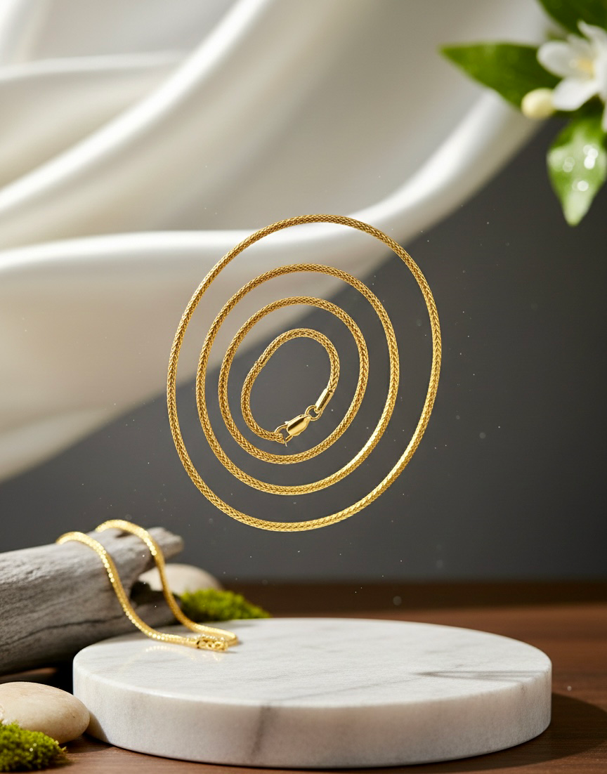 Elevate your everyday style with the timeless elegance of our Woven Wheat Chain. Inspired by the symmetrical beauty of a stalk of grain, this “Spiga” style necklace features four strands of interlaced gold links, creating a delicate yet durable braided texture.