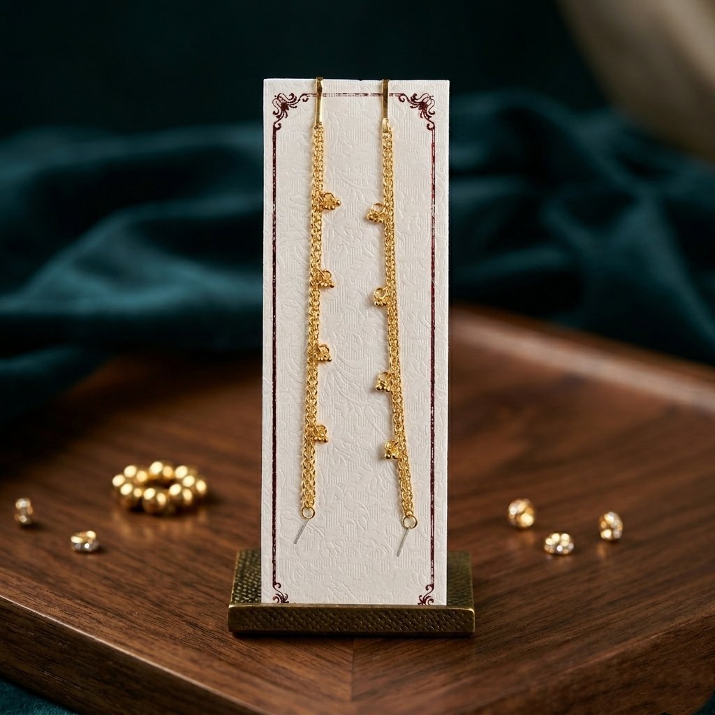 Elevate your traditional ensemble with these exquisitely crafted Kaan chains. Featuring a multi-strand design, each chain is meticulously detailed with delicate Ghungroo (tiny bell) motifs that offer a subtle, rhythmic charm.