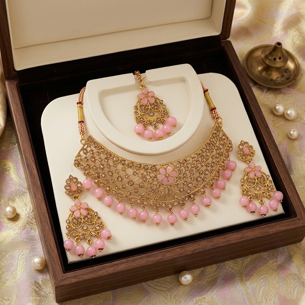 Elevate your ethnic wardrobe with this exquisite 4-piece jewelry ensemble. Designed for the modern bride or the festive guest, this set captures the timeless elegance of traditional Indian craftsmanship with a refreshing rose-pink twist.