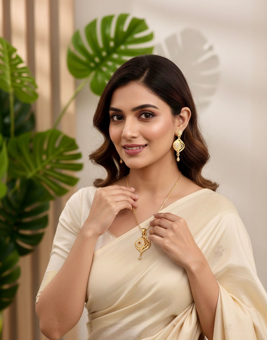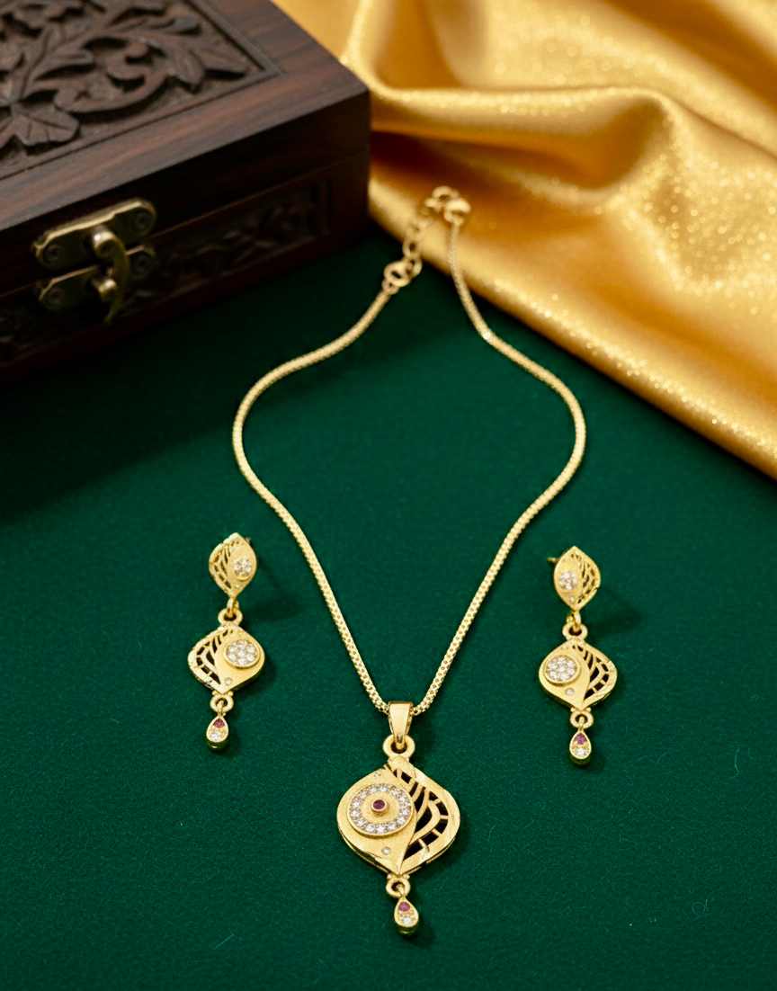 Gold-Plated Teardrop Pendant and Earring Set with Ruby-Red Accents Original price was: ₹999.00.Current price is: ₹239.00.