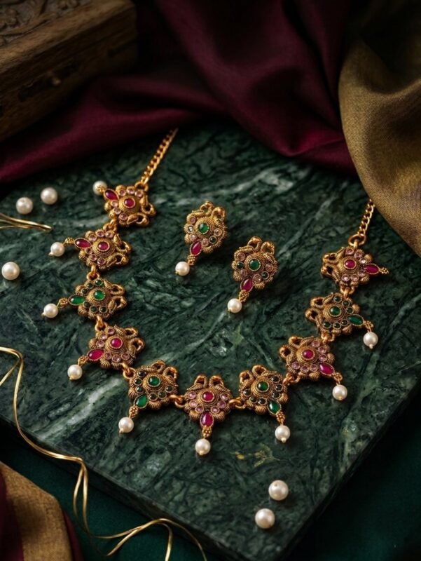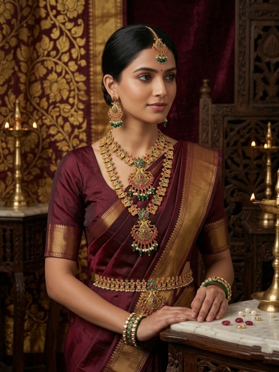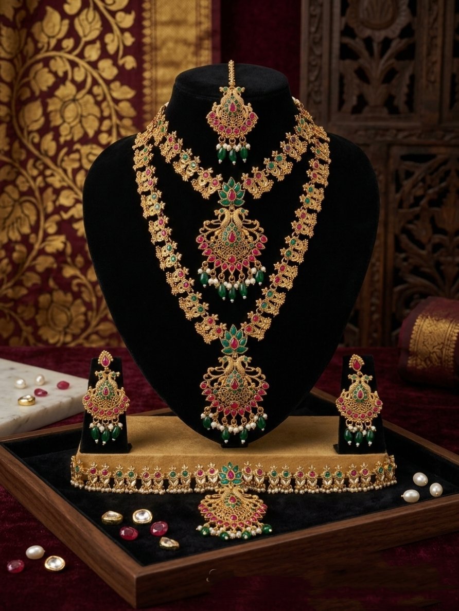 Styling Tip: Pair this set with a rich Kanjeevaram silk saree in cream, gold, or deep red to let the jewelry truly stand out.
