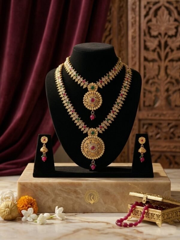 The Layered Look: Includes a majestic Haram (Long Necklace) and a matching Choker (Short Necklace) for a grand, layered appearance.