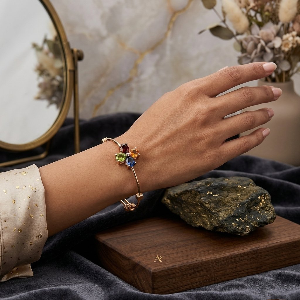 A burst of brilliance for your wrist. This striking bangle features a central “bloom” of four oval-cut crystals in a vivid array of jewel tones—ruby red, citrine orange, sapphire blue, and peridot green. Set on a sleek, polished gold-tone band, this piece perfectly balances bold color with minimalist structure, making it a standout addition to any jewelry collection.