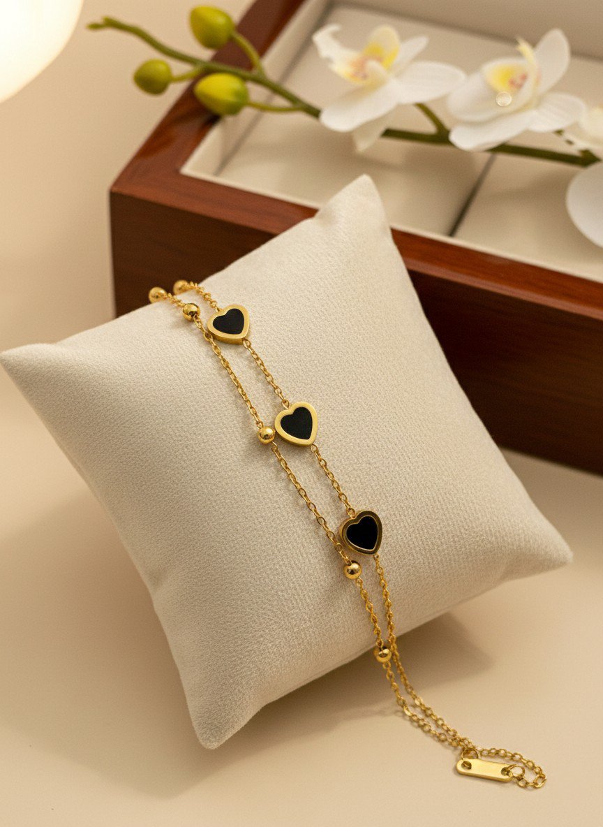 Elevate your everyday elegance with this stunning Double-Strand Heart Bracelet. Featuring delicate gold-toned chains, this piece is punctuated by exquisite heart-shaped charms inlaid with deep black enamel. The dual-layer design creates a stacked look with a single clasp, offering a perfect balance of sophisticated minimalism and bold contrast.