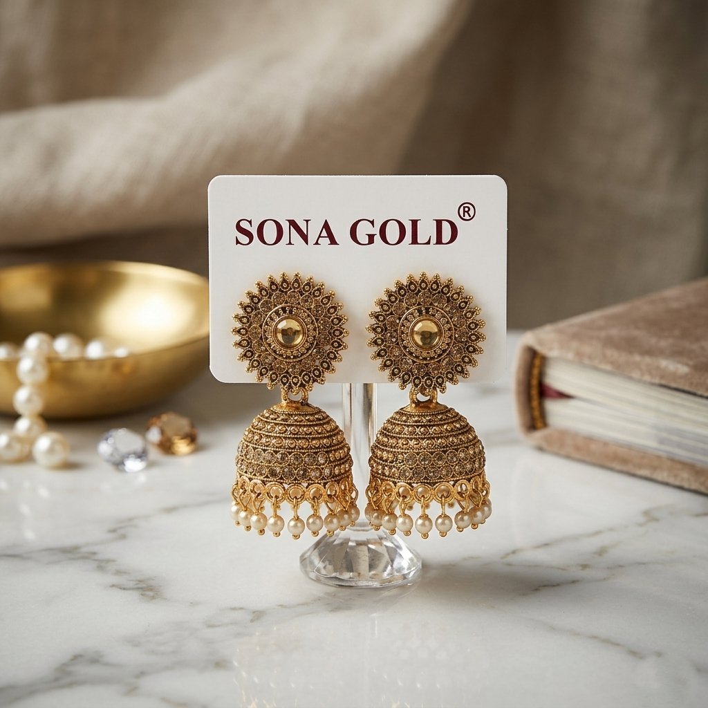 Elevate your ethnic wardrobe with these exquisitely crafted Jhumka earrings from the Sona Gold collection. Blending traditional artistry with contemporary elegance, these earrings are designed to make a statement at weddings, festivals, and special occasions.