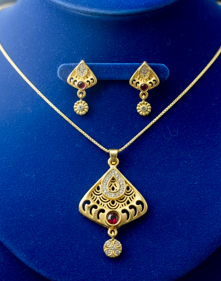 Gold-Plated Teardrop Pendant and Earring Set with Ruby-Red Accents