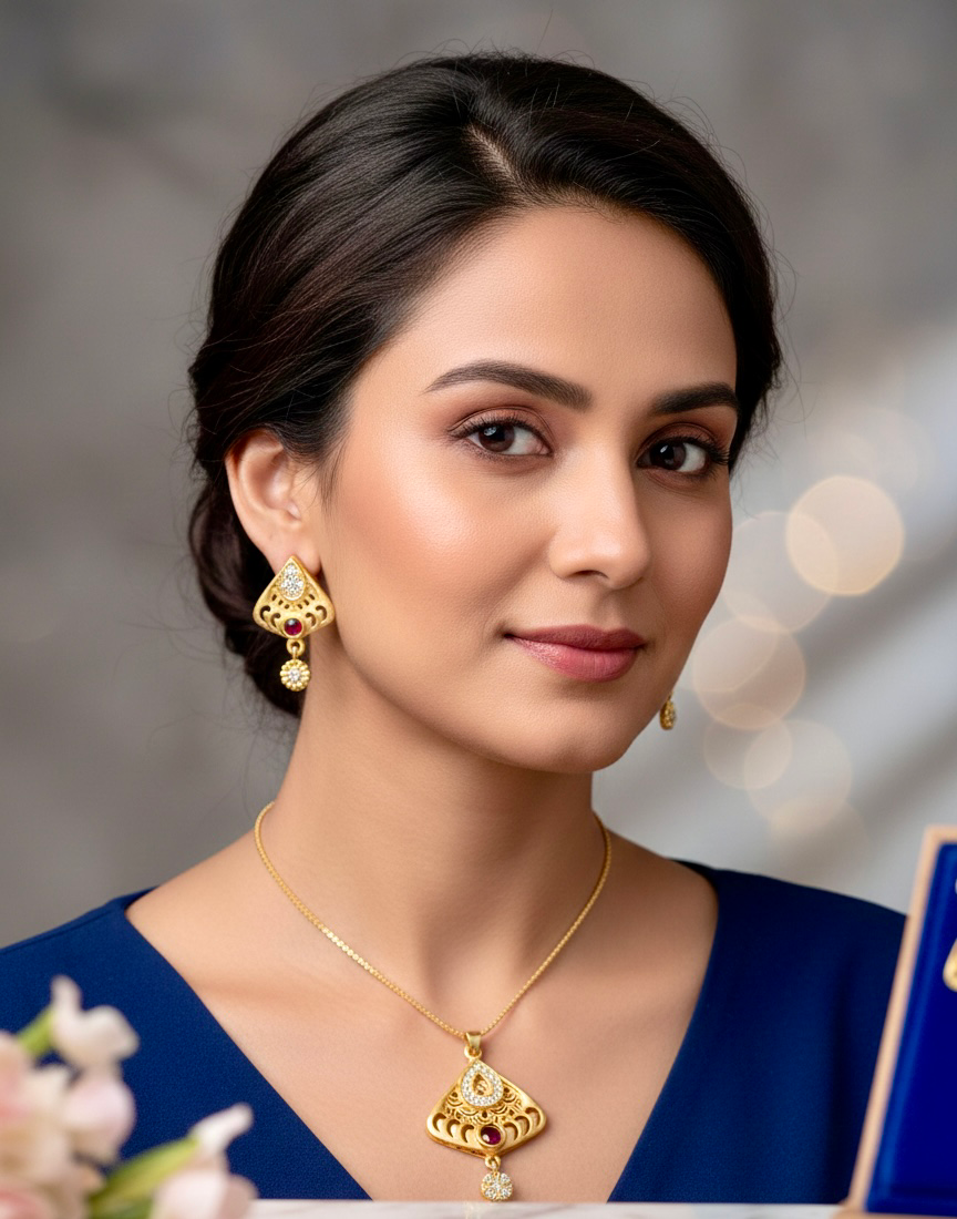 Be the first to review “Gold-Plated Teardrop Pendant and Earring Set with Ruby-Red Accents”