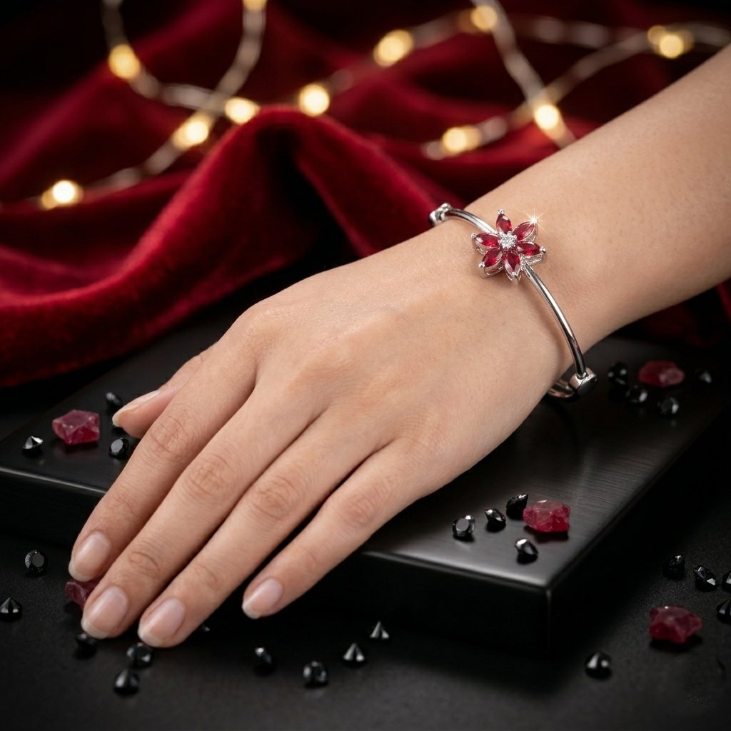 A centerpiece of timeless passion. This sophisticated bangle features a magnificent floral motif crafted from six perfectly symmetrical, marquise-cut ruby-red crystals. Set on a sleek, high-shine silver-tone band, the deep crimson petals radiate from a shimmering crystal center, capturing the light with every movement of your wrist.