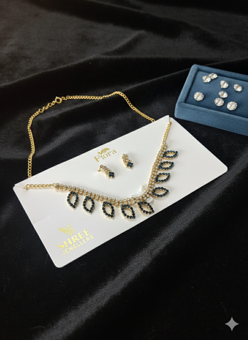 Elevate your jewelry collection with this stunning gold-plated necklace and earring ensemble. Designed with a focus on delicate craftsmanship and bold contrast, this set is a versatile masterpiece for weddings, parties, or festive celebrations.