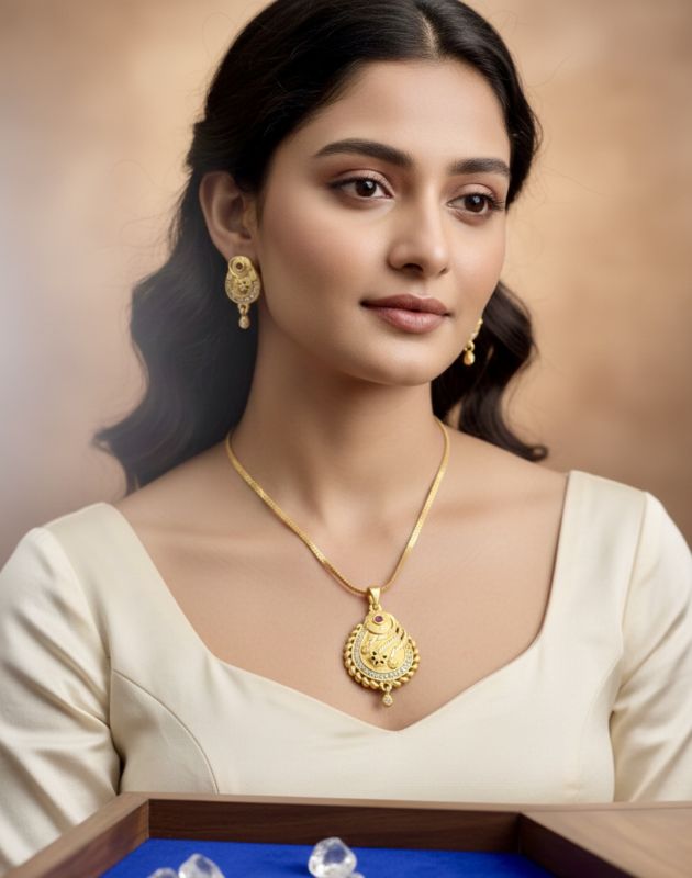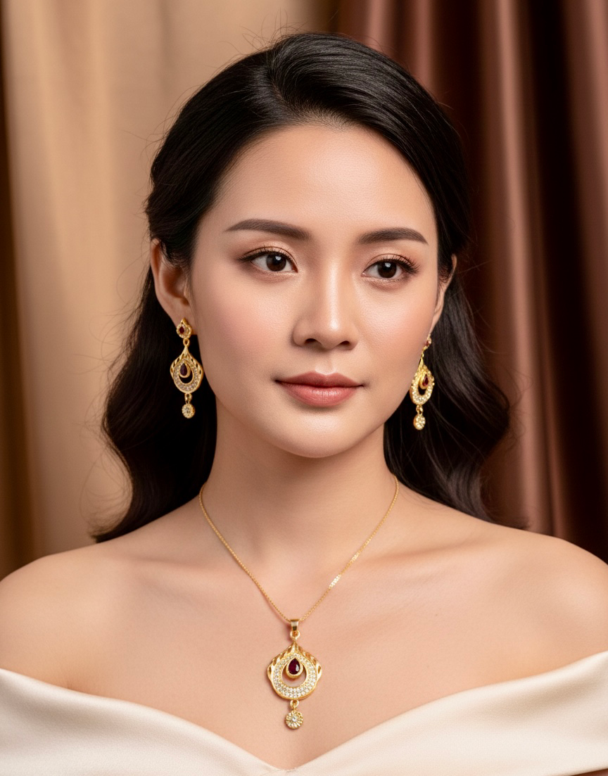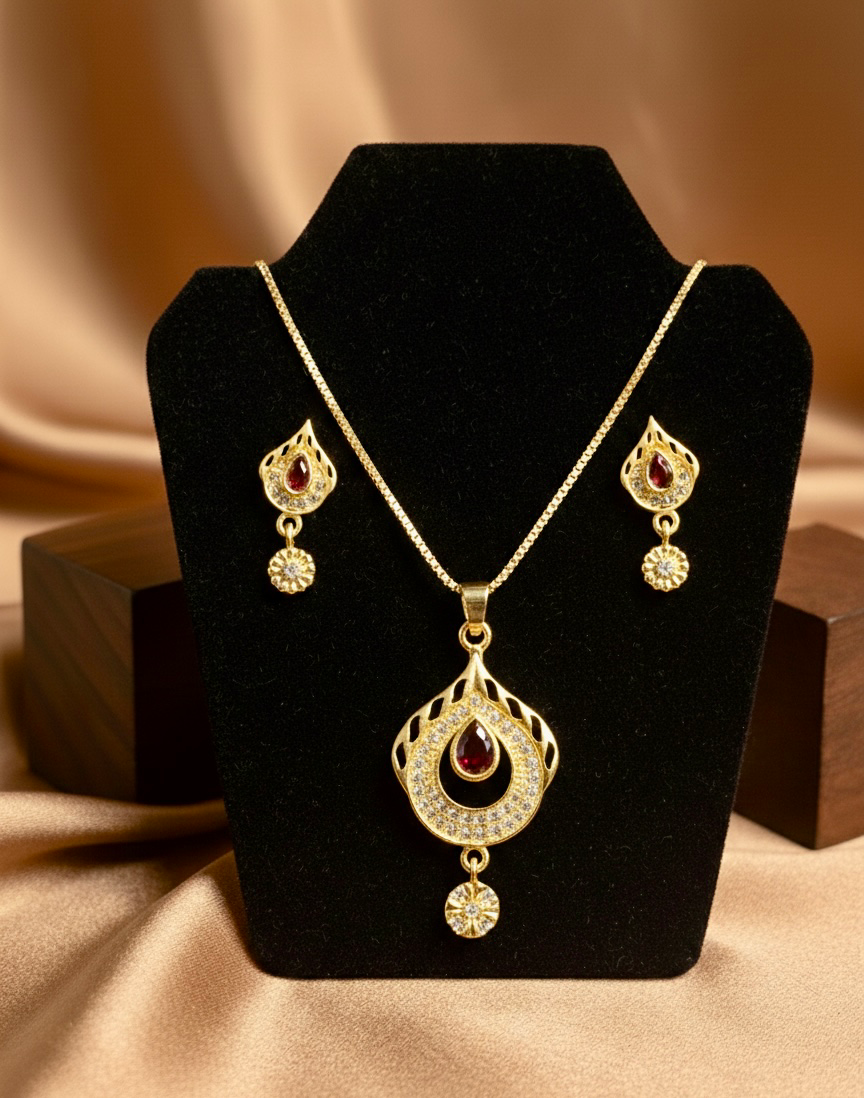“Ruby Empress” Teardrop Pendant & Earring Set in 18K Gold Finish