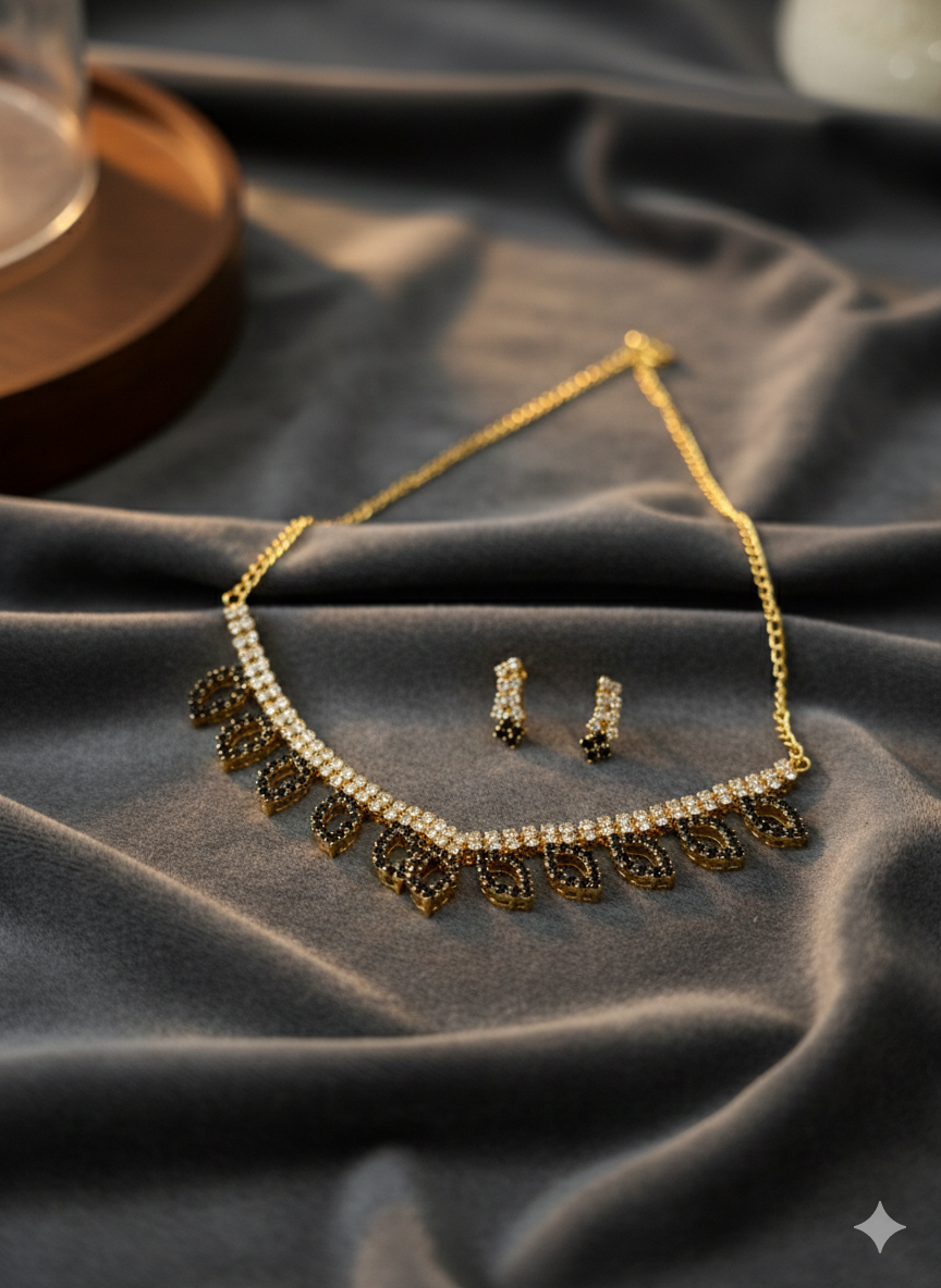 Elevate your jewelry collection with this stunning gold-plated necklace and earring ensemble. Designed with a focus on delicate craftsmanship and bold contrast, this set is a versatile masterpiece for weddings, parties, or festive celebrations.