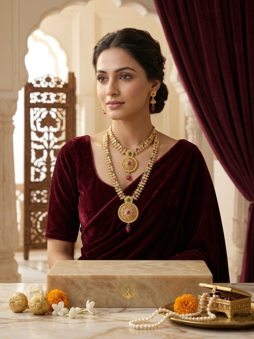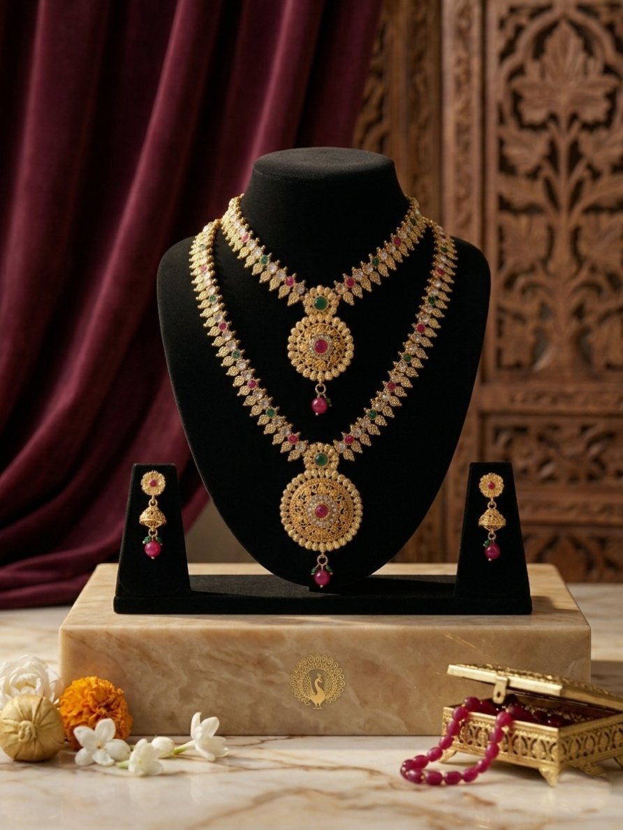 Matching Jhumkas: Includes a pair of classic Jhumka earrings that perfectly mirror the intricate design of the necklaces, completing your traditional look.