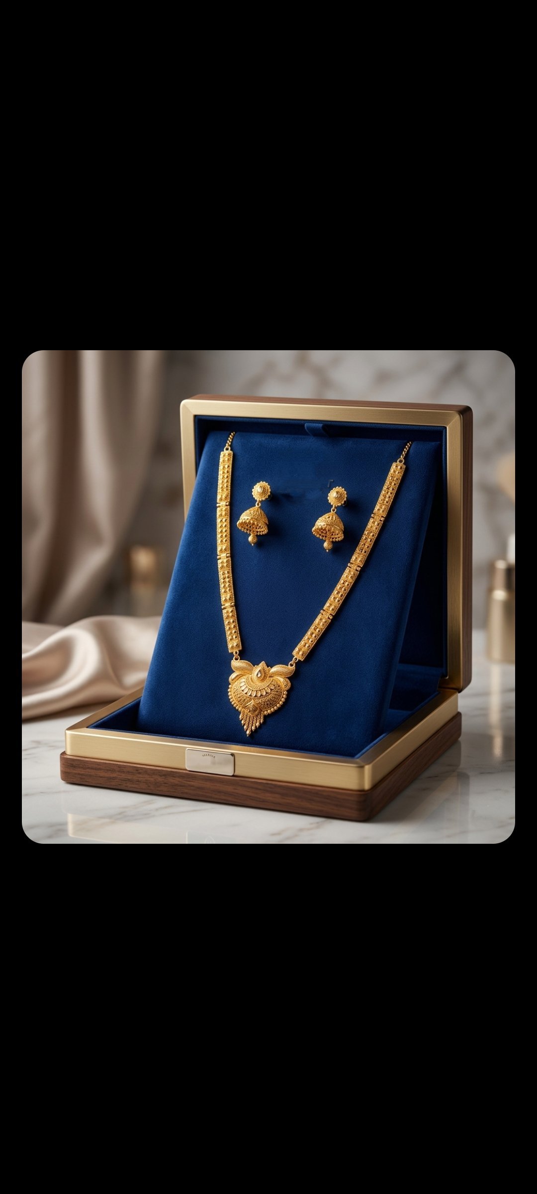 This exquisite jewelry set features a meticulously crafted long-chain necklace and matching earrings, presented in a premium velvet-lined display box. Designed with a deep respect for heritage, the set captures the essence of royal Indian aesthetics.