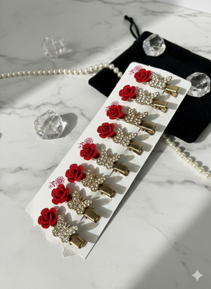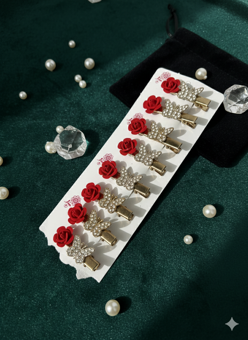Red Rose and Crystal Pearl Accented Gold Hair Clips (1pair Rs.20)
